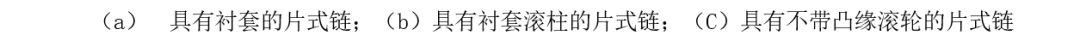 图2(b)所示为衬套滚柱链。其特点是衬套上活套滚柱,当衬套滚柱与链轮啮合时,滚柱在衬套上转动,但相对于轮齿不动,因而大大减轻轮齿的磨损。在链续输送机中,广泛地使用带有滚轮的片式链。滚轮直径较大,超出链片之外图2(c)。滚轮作用与滚柱相同且支撑链条。